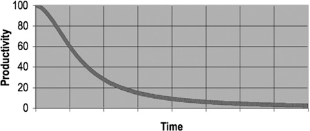 As the mess builds, the productivity of the team continues to decrease, asymptotically approaching zero. As productivity decreases, management does the only thing they can; they add more staff to the project in hopes of increasing productivity. But that new staff is not versed in the design of the system. They don’t know the difference between a change that matches the design intent and a change that thwarts the design intent. Furthermore, they, and everyone else on the team, are under horrific pressure to increase productivity. So they all make more and more messes, driving the productivity ever further toward zero. (See Figure 1-1.)